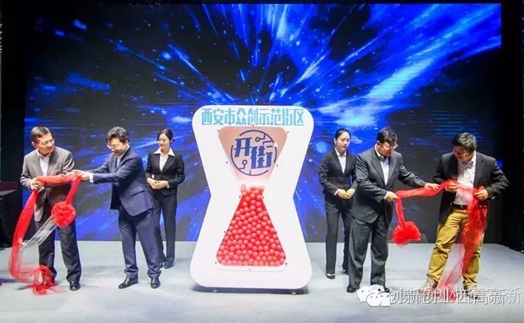 市委常委、高新区管委会书记赵红专与牛文文董事长、杨宁会长、胡小龙董事长共同拉动启动装置,宣布西安市众创示范街区正式开街。