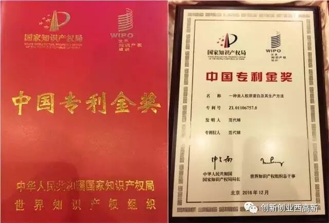 ▲ 范代娣教授完成的“一种类人胶原蛋白及其生产方法(中国发明专利ZL 01106757.8)”荣获2016年中国专利金奖