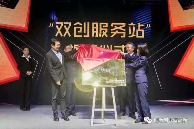 高新区党工委副书记、管委会副主任杨仁华与工商高新分局局长冯荣、地税高新分局正处级调研员吴建军、国税高新分局副局长白瑜共同为西安市众创示范街区“双创服务站”揭牌;
