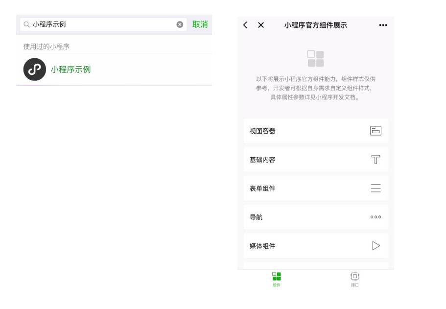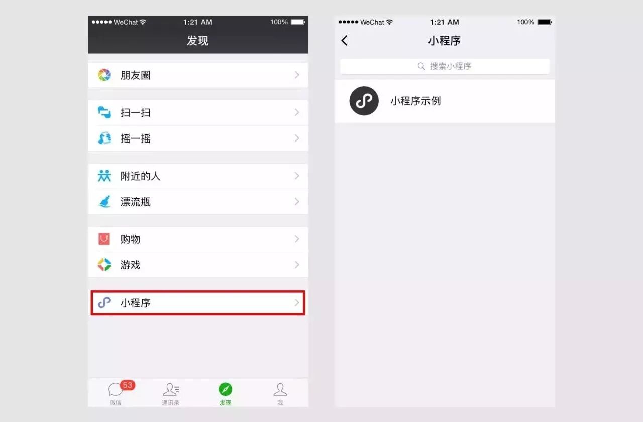 在微信客户端最上方的搜索窗口,通过搜索“小程序示例”,进入后,点击下方接口,即可接入小程序,再退回至微信发现页面,小程序接口已经在这里啦。