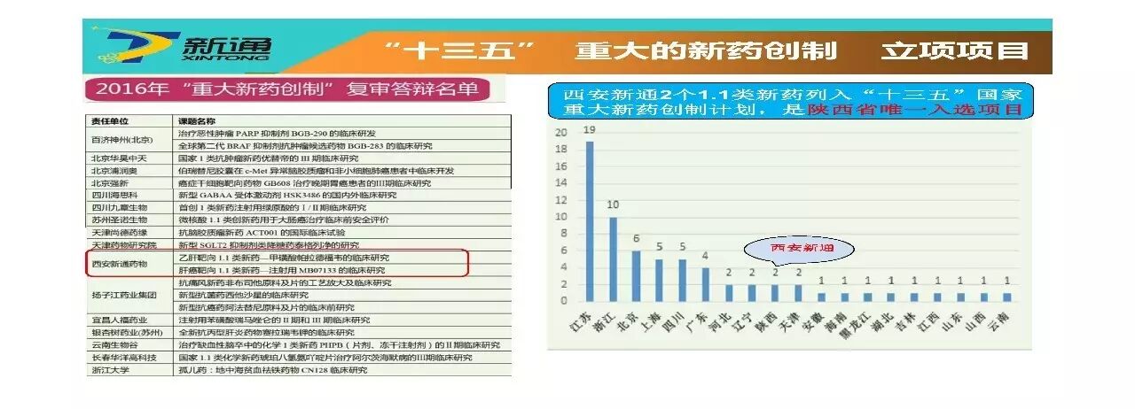 西安新通药物研究有限公司,其自主拥有的《HepDirectTM技术肝靶向创新药物研究》平台及利用该平台研究的二个个1.1类创新药子课题《乙肝靶向1.1类新药-甲磺酸帕拉德福韦的临床研究》和《肝癌靶向1.1类新药-注射用MB07133的临床研究》获得国家“十三五”重大新药创制专项资金支持,也是我省唯一获得“十三五”重大新药创制计划支持的两个化学创新药物。