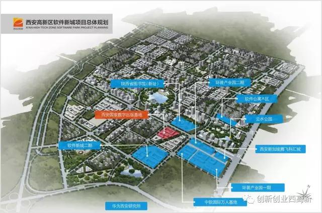 软件新城建成项目: 西安国家数字出版基地、陕西省图书馆(新址)、环普产业园、中软万人基地、腾飞科汇城、航微微软创新中心、华为西安研究院、中船重工、软件公寓、云水公园等。