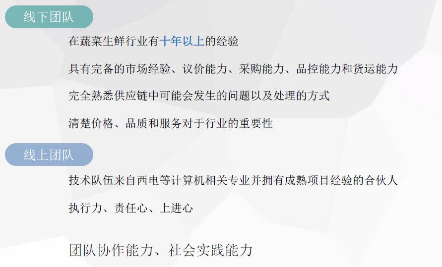 自由搭的将2B和2C两种模式结合起来。在B端,主要服务餐饮业主、学校食堂和大型酒店,就近设立小型仓库,可以快速提供生鲜配送服务。自由搭旨在解决餐饮店业主的三个问题:一是起早贪黑自己去采购,无法在一家供应商购买所有的食材;二是传统供应商提供的食材价格高,质量却无法保证的问题;三是餐饮业主需要临时“补货”时,时间和空间难以兼顾以及生鲜价格不透明等问题。 在C端,小型仓库也是实体销售店,保留适量的新鲜蔬菜以满足周边消费者自购生鲜的需求,这一部分更多的是解决中老年人的买菜问题。此外,也满足线上白领、蓝领们网上购买生鲜的需求。通过网点式线下小型实体店的布局与线上平台的结合,可以说解决了传统生鲜在保鲜和减损方面的问题。 自由搭目前主力是开发B端,B端应用已经在2016年10月份上线,并且已经与十几家餐饮公司开展合作,获得不错的反响。目前正在准备C端的应用开发,预计在正式拿到融资之后的3个月内上线。 自由搭的蔬菜主要来源是一级生鲜批发市场,下一步计划直接从农田里获得更为新鲜的生鲜蔬菜。通过市场规模的扩大,降低生鲜的价格,让酒店和消费者获益。目前自由搭的主要来源于生鲜销售的差价,目前处于盈利状态。 采访中了解到,创始人欧阳成龙和联合创始人谢正权都是两名90后创业者。欧阳成龙说:“创业需要激情和坚持,要把最基本的事情做好。”目前生鲜市场待开发空间还很大,经过了一轮洗牌的O2O,在进入生鲜行业更需谨慎,生鲜虽是“刚需”,但只有保证生鲜物美价廉和质量安全,才能实现长远发展。满足这个的前提条件之后,搭配上更好模式和框架才能把生鲜电商这个体系完成起来,形成一个良性的产业链。